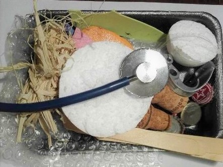 Ho preparato dei vassoi con materiale di vario genere e con lo stetoscopio i bambini hanno potuto auscultare il suono prodotto. Tante sono state le suggestioni rievocate!