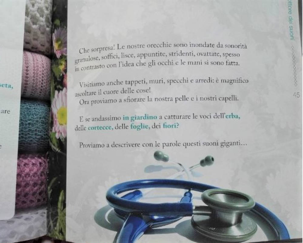“Un mestolo, una sveglia, un barattolo, un imbuto, una manciata di foglie secche, un pugno di sabbia, un vasetto di semi possono diventare un incredibile strumentario per allestire un laboratorio di sperimentazioni acustiche e non solo. Paradossalmente è un invito a saper cogliere la pienezza del silenzio che è all’origine dei suoni, che li rende suggestivi e vibranti, ne scandisce l’entrata e l’attesa dei successivi e crea emozionanti incursioni nel linguaggio.”