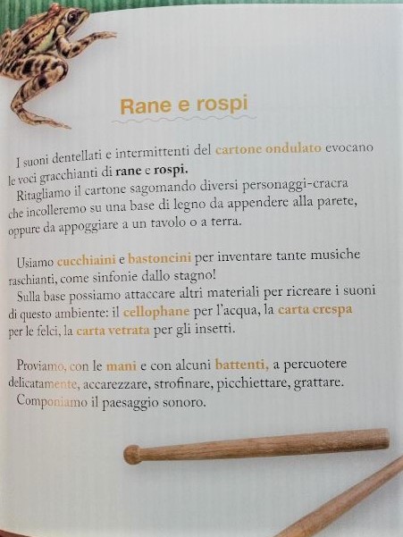 A chi dovesse progettare sperimentazioni sonore, percorsi musicali alternativi, presso Scuola dell’Infanzia o prime classi Scuola Primaria, consiglio caldamente: “Suoni per giocare” di Arianna Sedioli con la collaborazione di Cooperativa Sociale La Coccinella (Artebambini). Il libro è un’inesauribile fonte di idee che si possono realizzare esplorando ambienti che ci circondano o utilizzando oggetti di uso quotidiano, quindi facilmente reperibili e a basso costo.