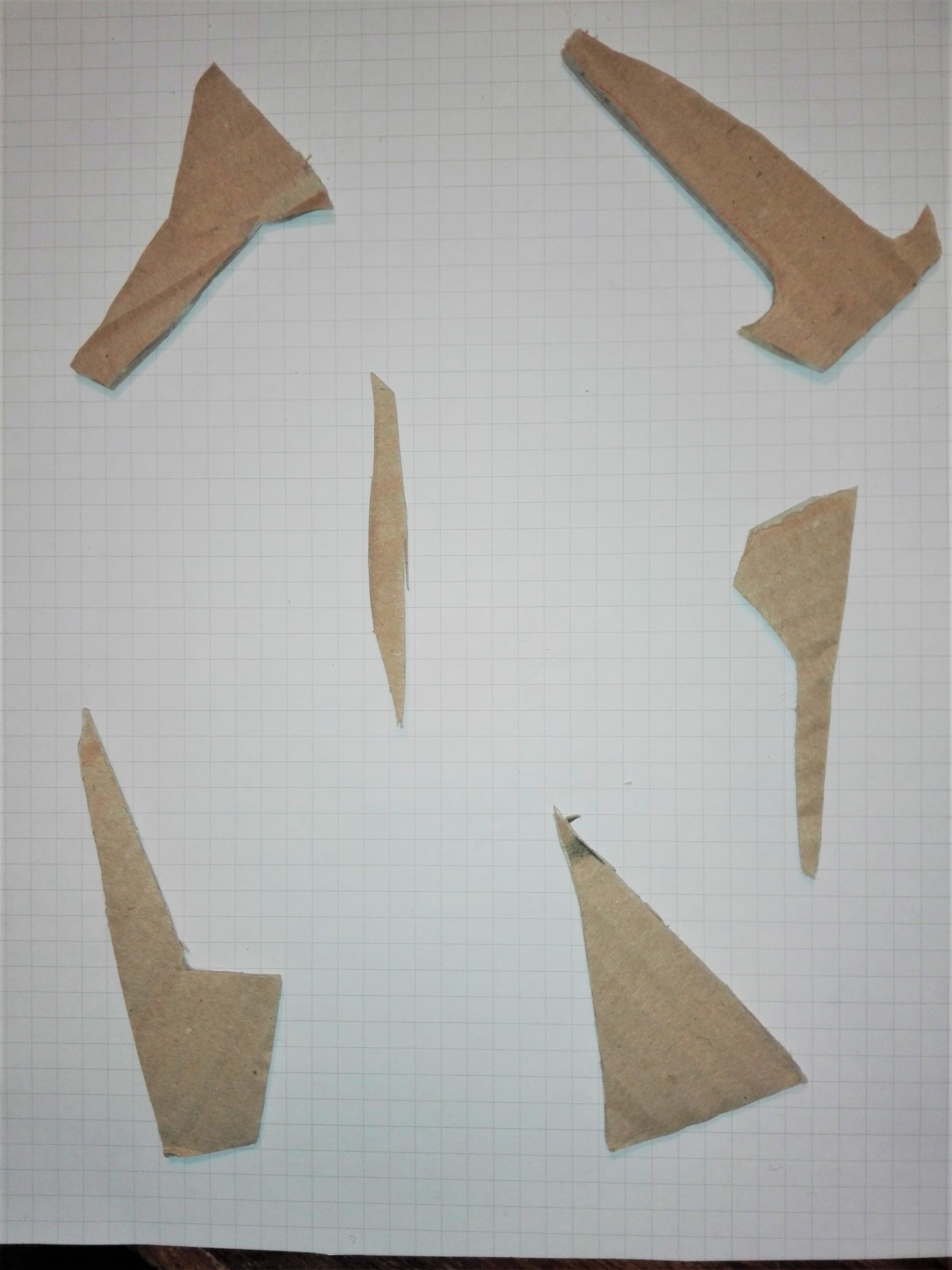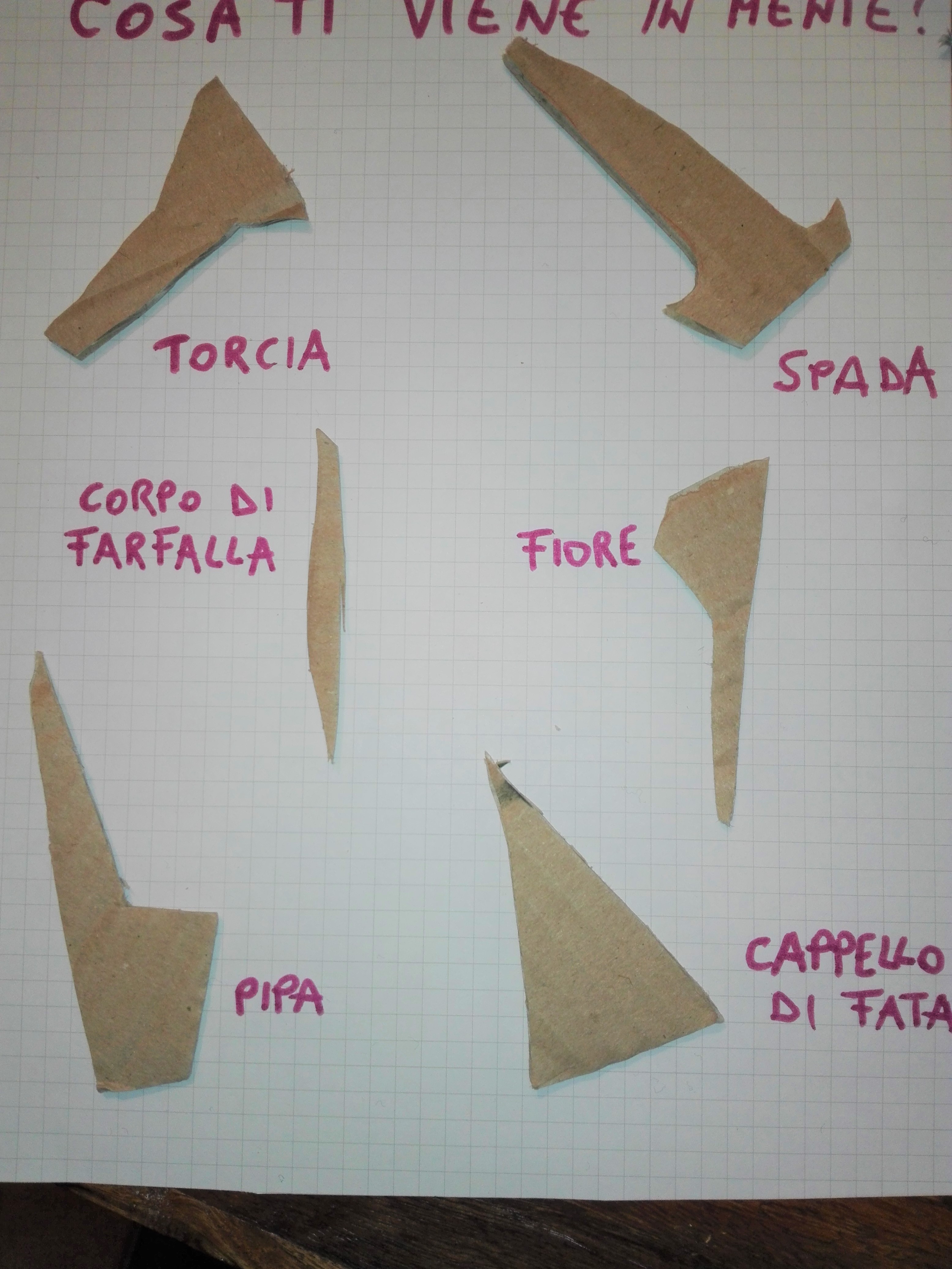 Intanto con i ritagli si può giocare: ne scelgo alcuni a caso, li appoggio su un foglio e li osservo, cosa mi fanno venire in mente?