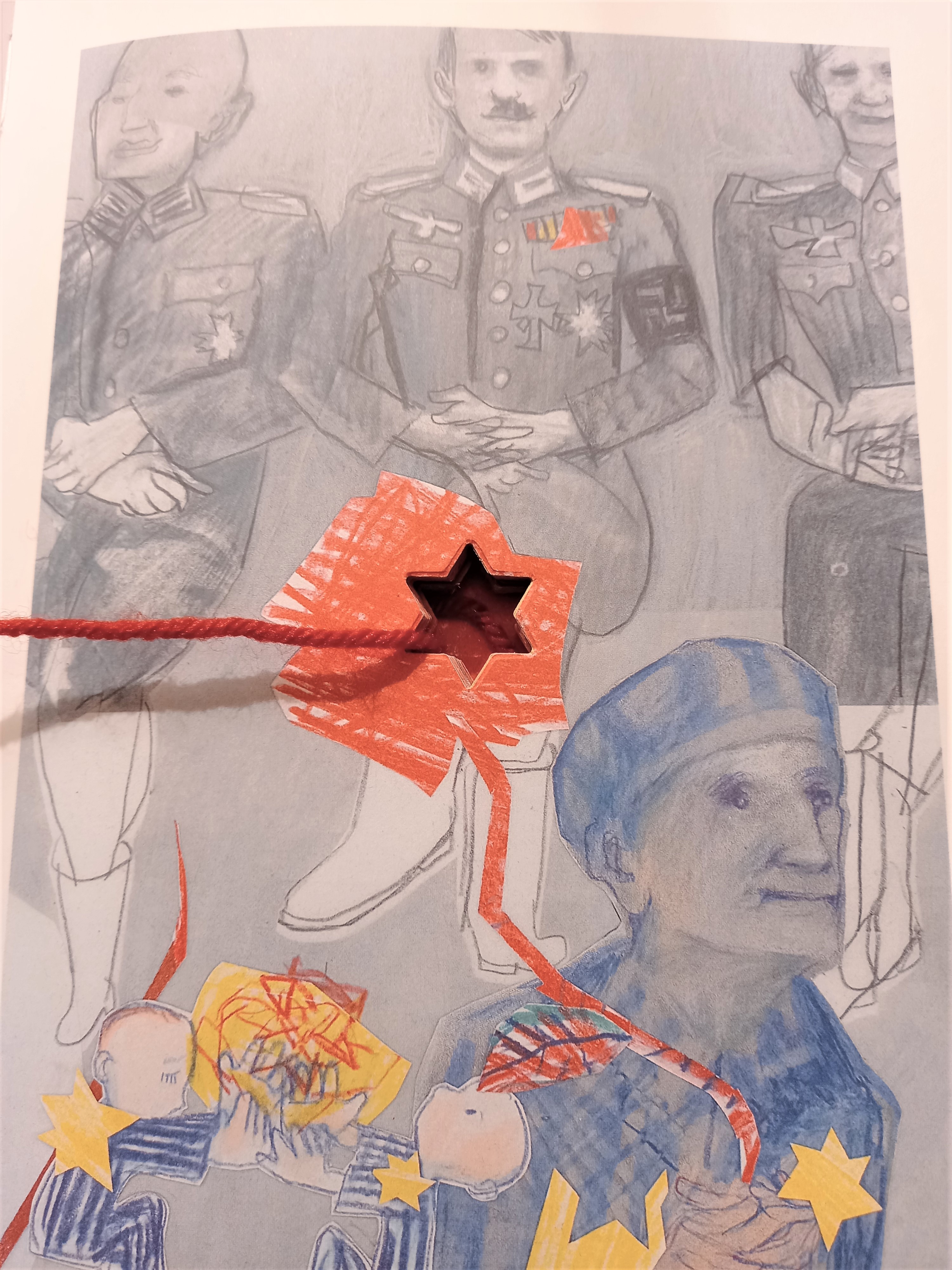 Ogni pagina è bucata, marchiata dalla stella. D’altro canto la FUSTELLA è uno strumento che permette di eseguire un taglio preciso su un foglio e qui, con un gioco di parole, FUSTELLA, “FU STELLA”, ha colpito, come un proiettile, la vita di dieci persone che hanno il compito di rappresentarne milioni.