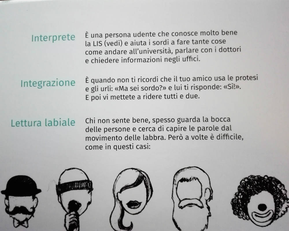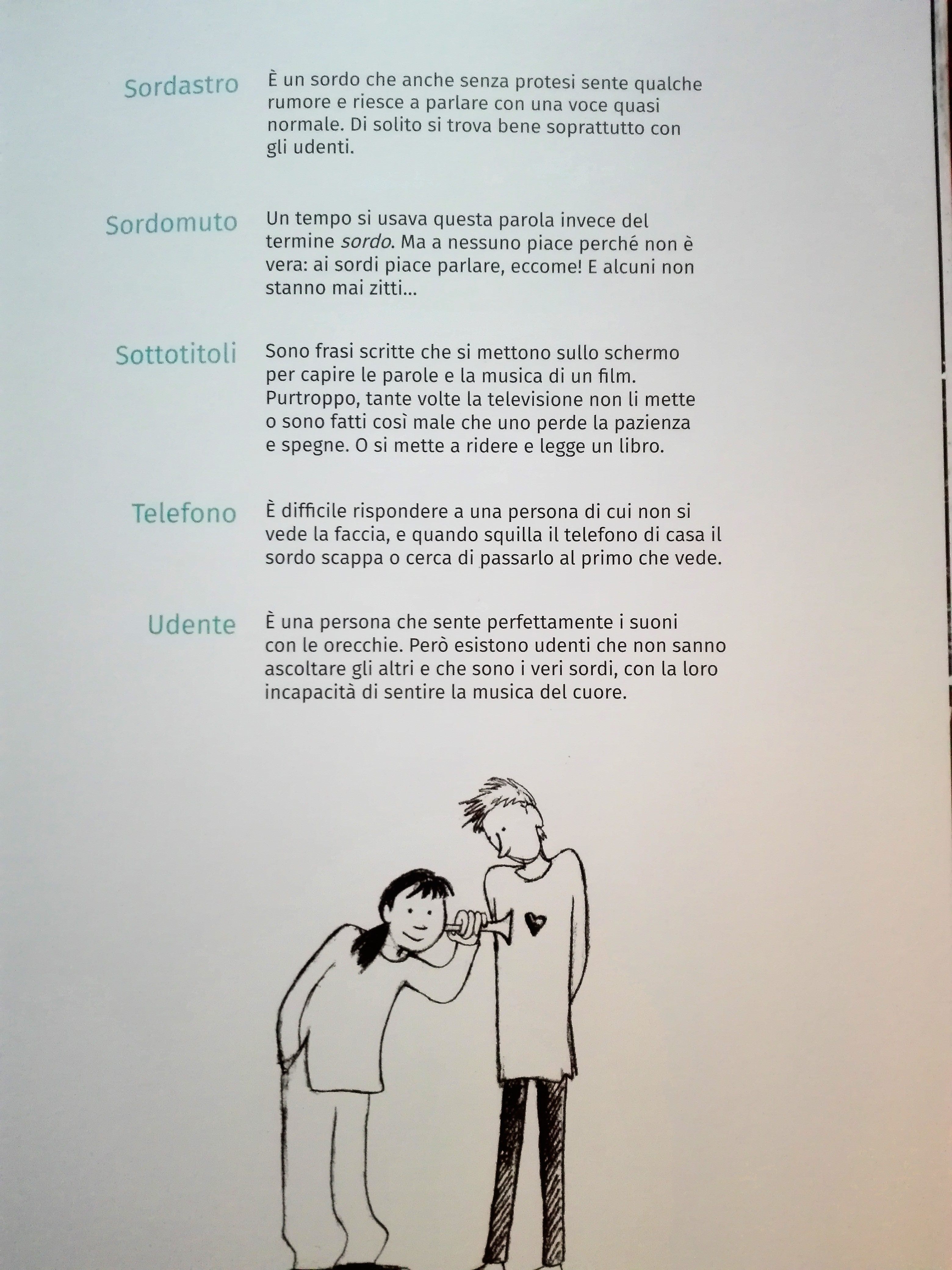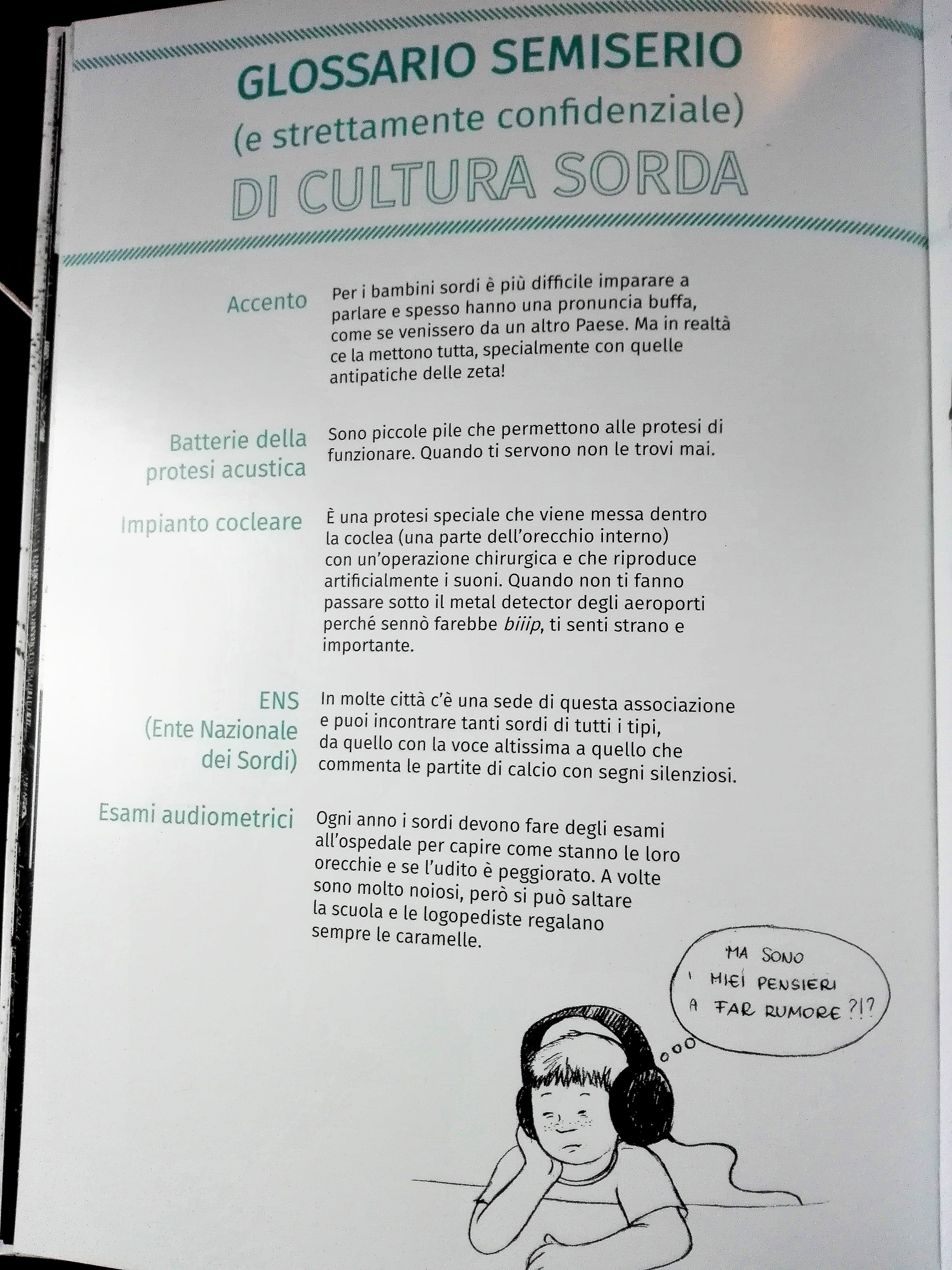 Monica lascia anche un Glossario Semiserio di Cultura Sorda: fra le varie parole e sigle, spiega cos’è un impianto cocleare, cos’è la LIS, chi è l’interprete. Indica anche cos’è INTEGRAZIONE: “E’ quando non ti ricordi che il tuo amico usa le protesi e gli urli:”Ma sei sordo?” e lui ti risponde : “Si!”. E poi vi mettete a ridere tutti e due”.