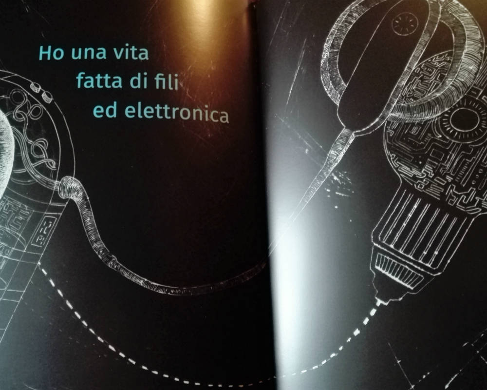 Ha una vita fatta di fili ed elettronica: impianto cocleare, protesi acustica; ma nel contempo la sua vita è fatta anche di eterno silenzio.