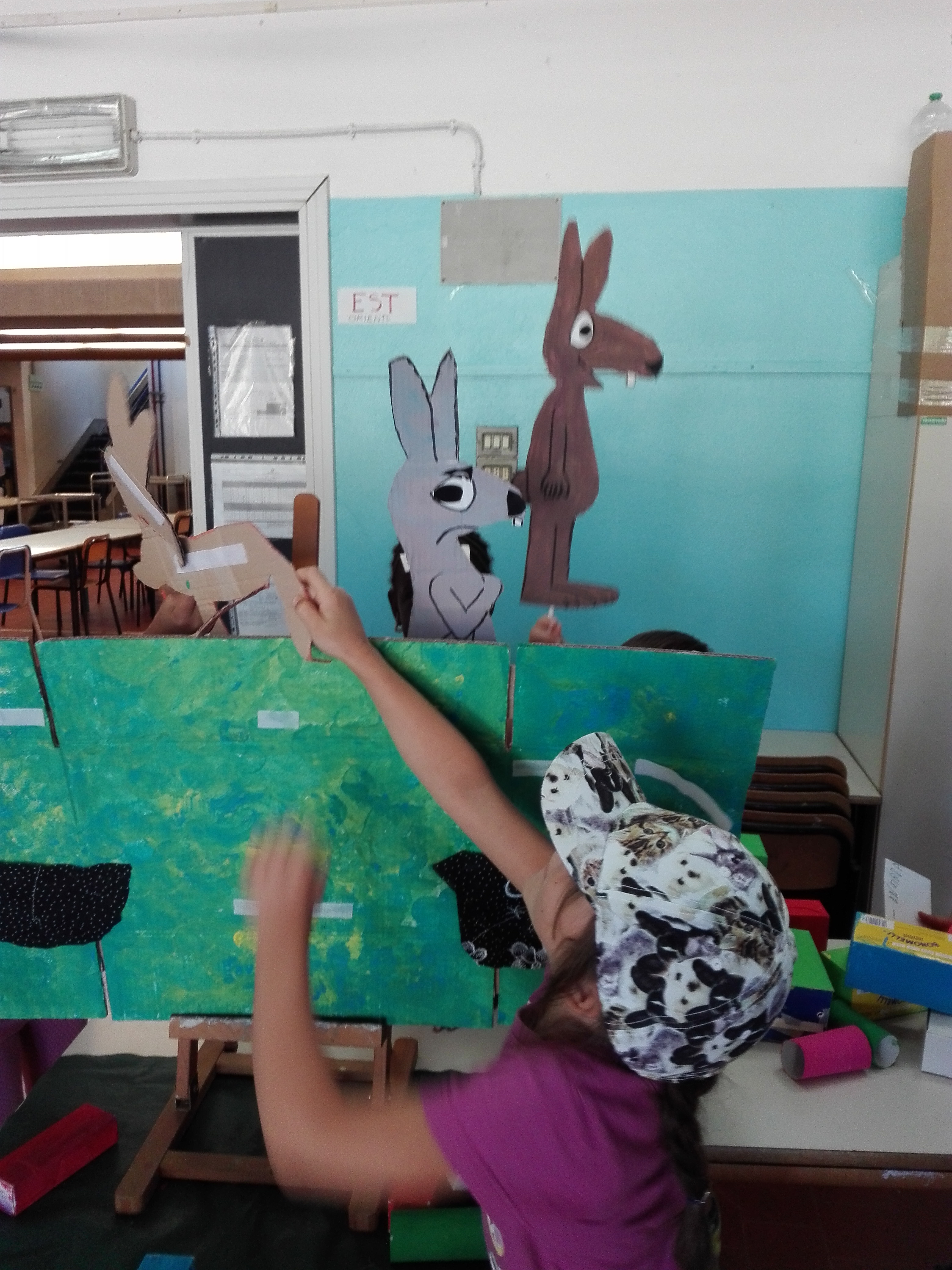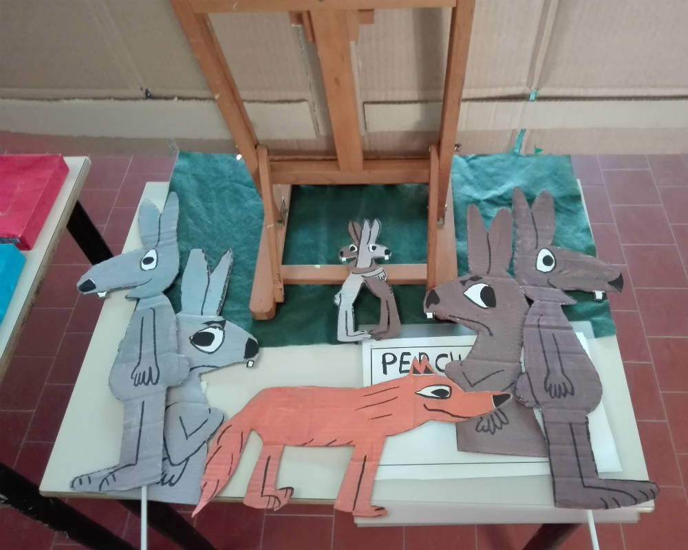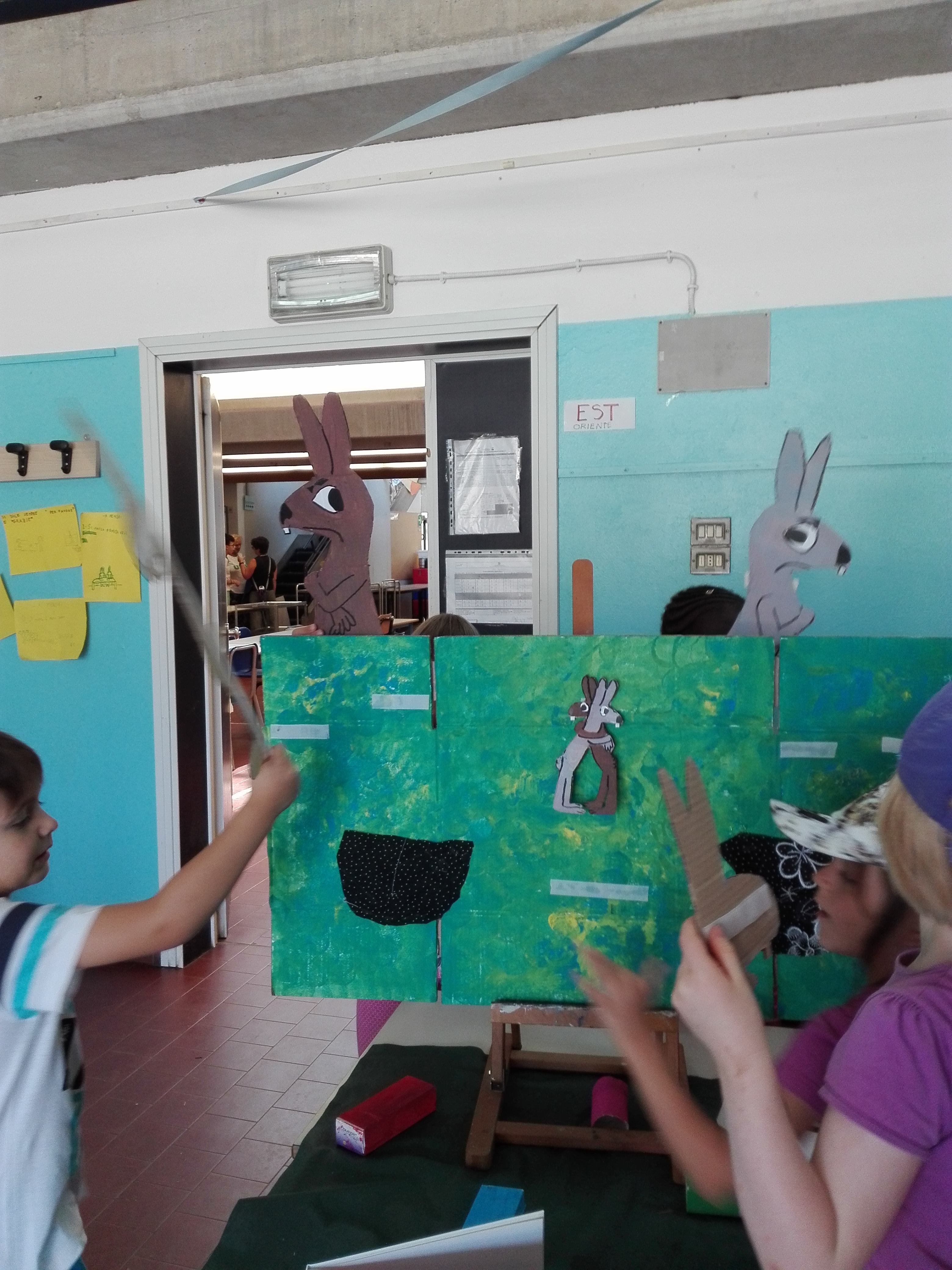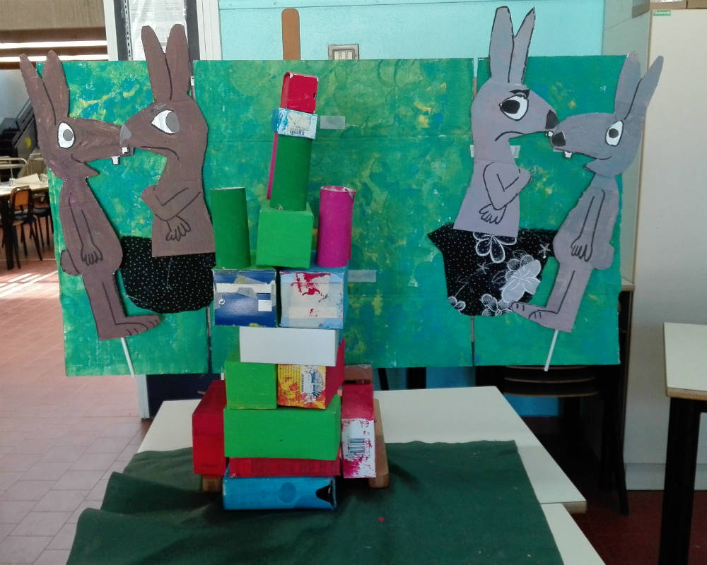 Poi si inizia con la lettura animata del libro “Il litigio” di Claude Boujon. Per questo momento è stato allestito un angolo in cui c’è una piccola scenografia che desta subito molta curiosità. Dietro alle “quinte” vi sono dei personaggi che usciranno nel corso della lettura. I bambini, durante l’evoluzione del racconto, vengono convocati più volte per prevedere le reazioni dei protagonisti Bruno e Bigio, oppure i loro stati d’animo e, ad un certo punto, vengono chiamati anche a costruire con scatole colorate, un muro divisorio fra le tane dei due conigli.