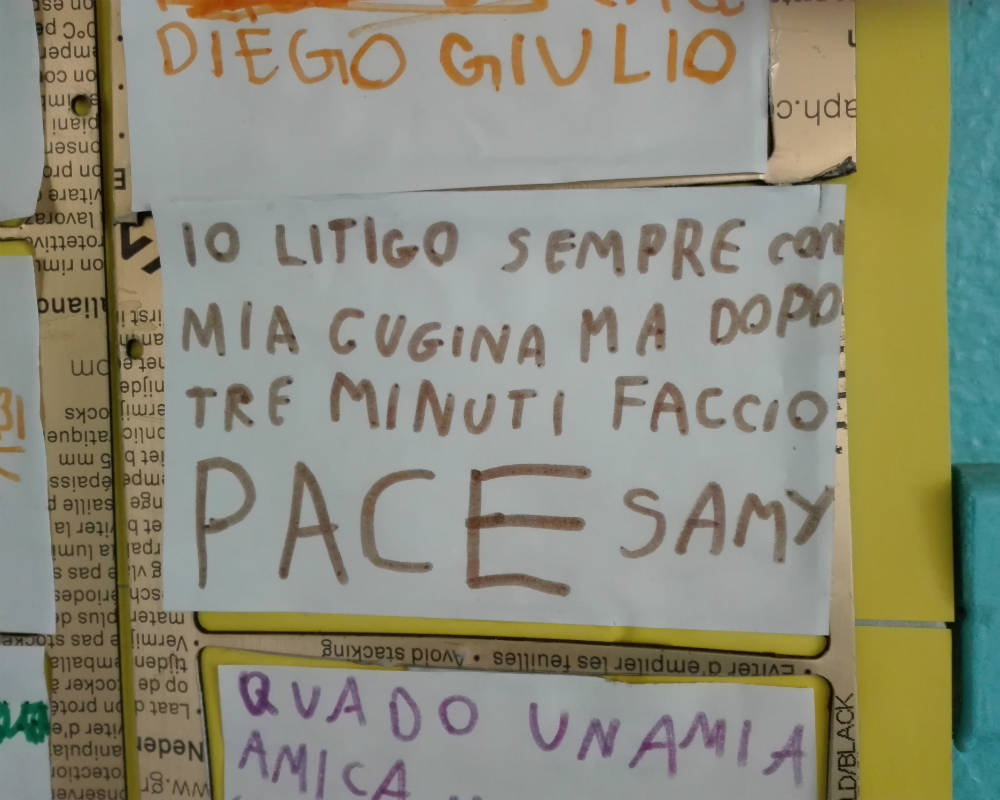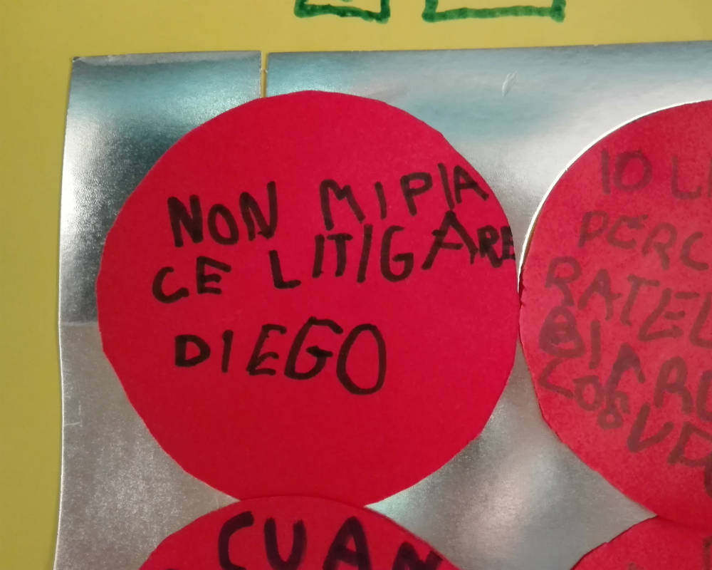 L’incontro si conclude con un pensiero sul litigio scritto da parte di ciascun bambino. I pensieri vengono attaccati su di un cartellone. In questo modo tutti lasciano una traccia di sé.