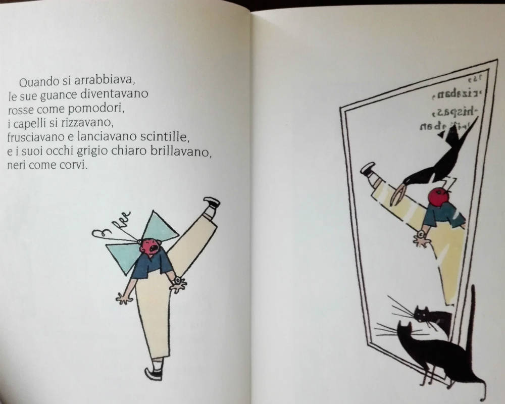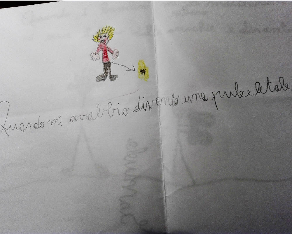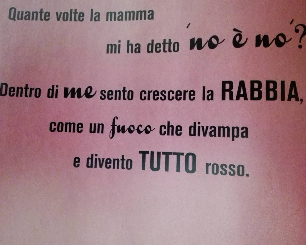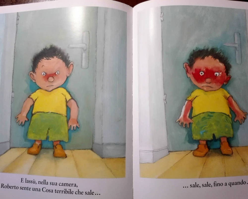 “Quando sono arrabbiato divento un drago gigante che distrugge tutto sul suo cammino. La rabbia brucia dentro di me e deve uscire. Sputo la parole più terribili senza pensarci. Già, un drago non pensa….Alla fine rimango da solo, con il mio GRANDE sedere da drago, sulle rovine della mia cameretta”