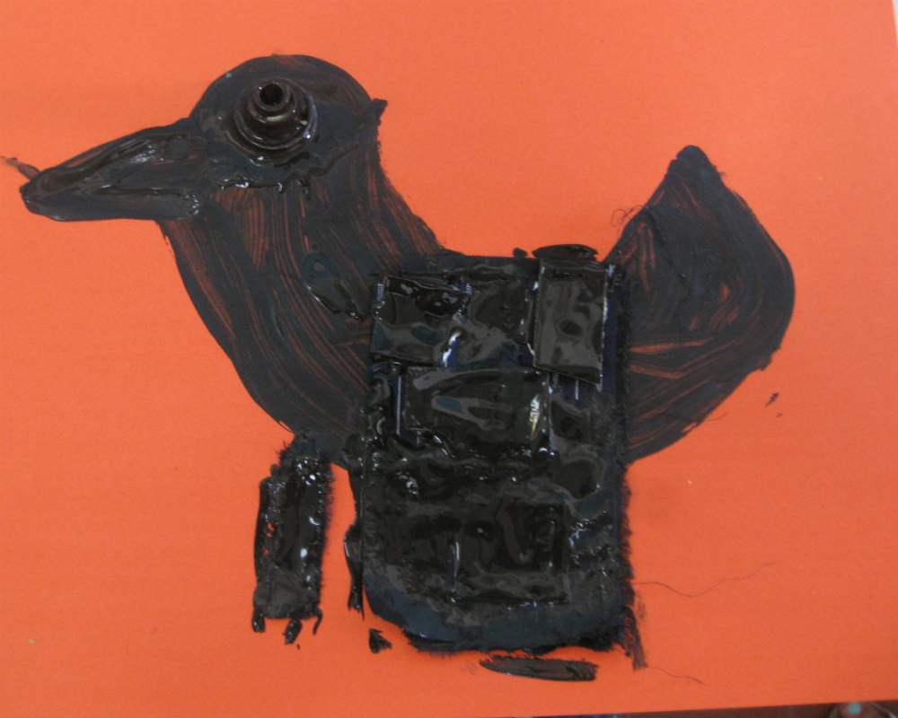 Alcuni hanno usato solo la tempera, altri hanno usato tecnica mista- tempera e materiali di riciclo, altri ancora hanno chiesto di poter realizzare il bambino corvo sul pavimento solo con materiale di riciclo.