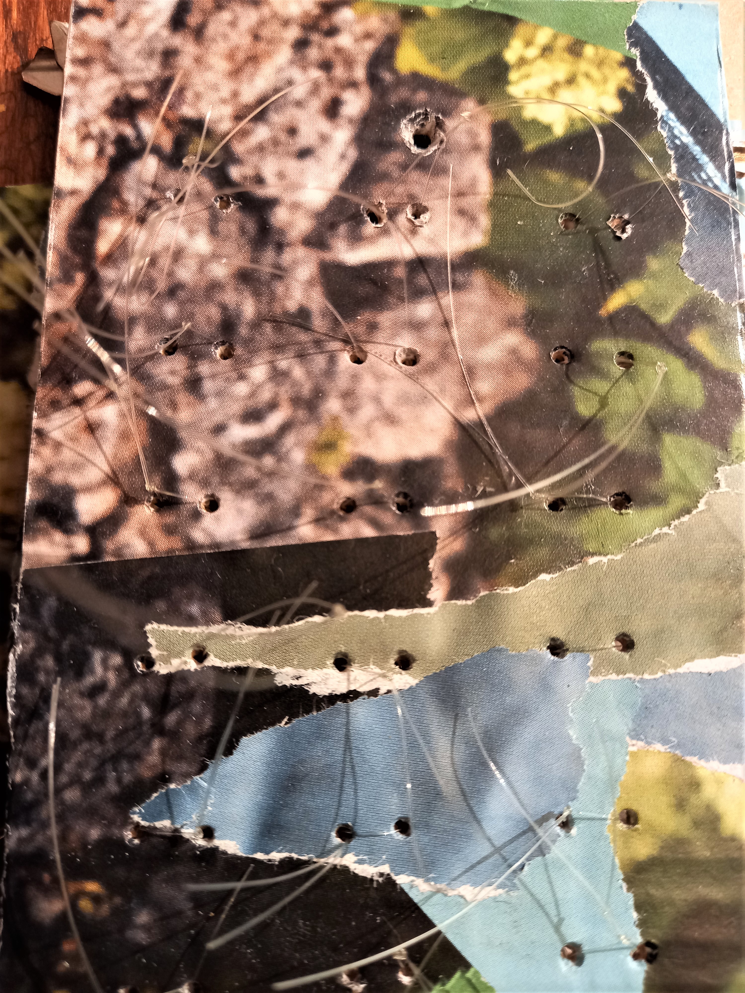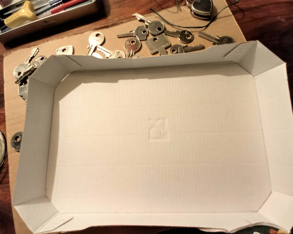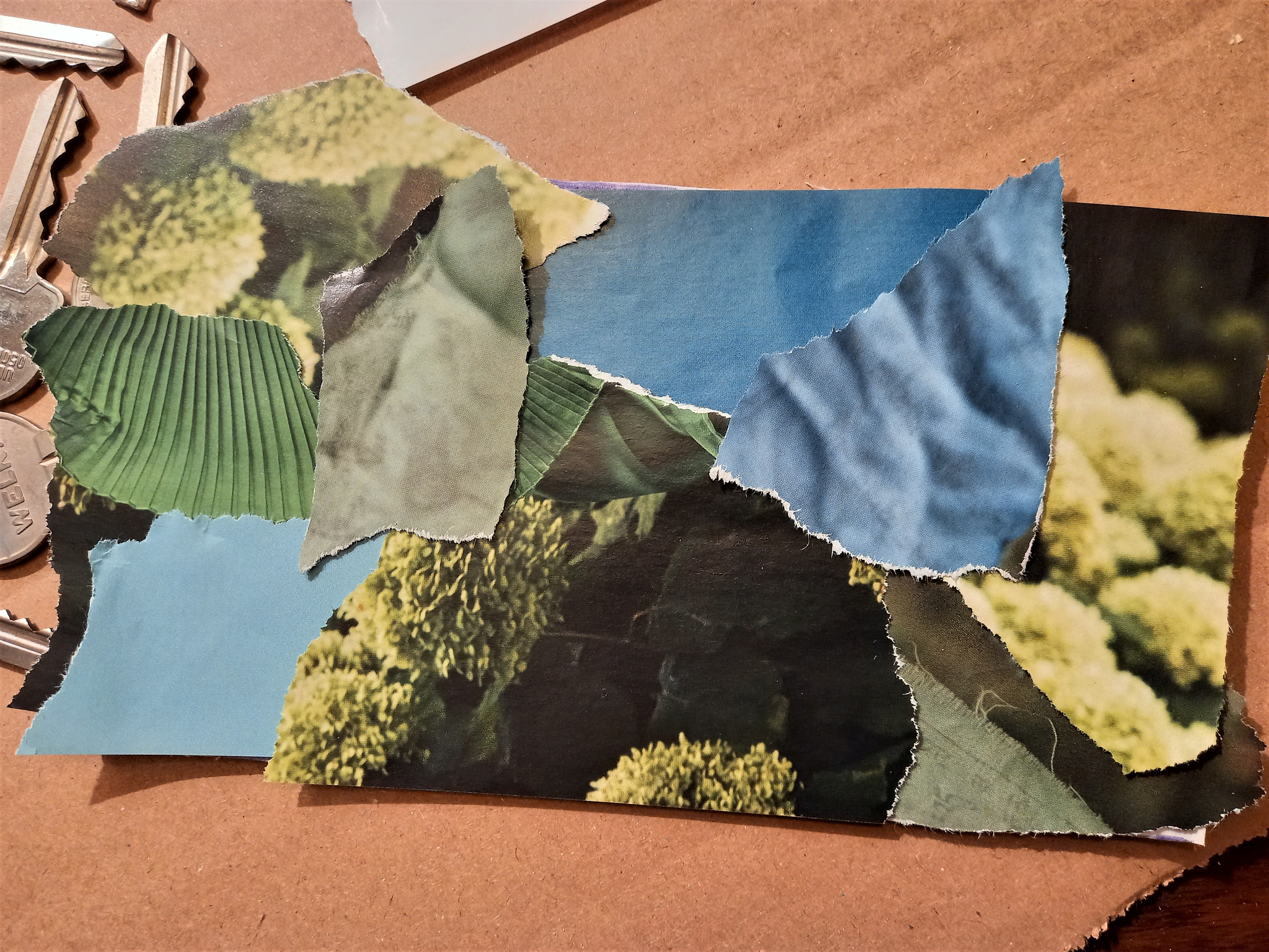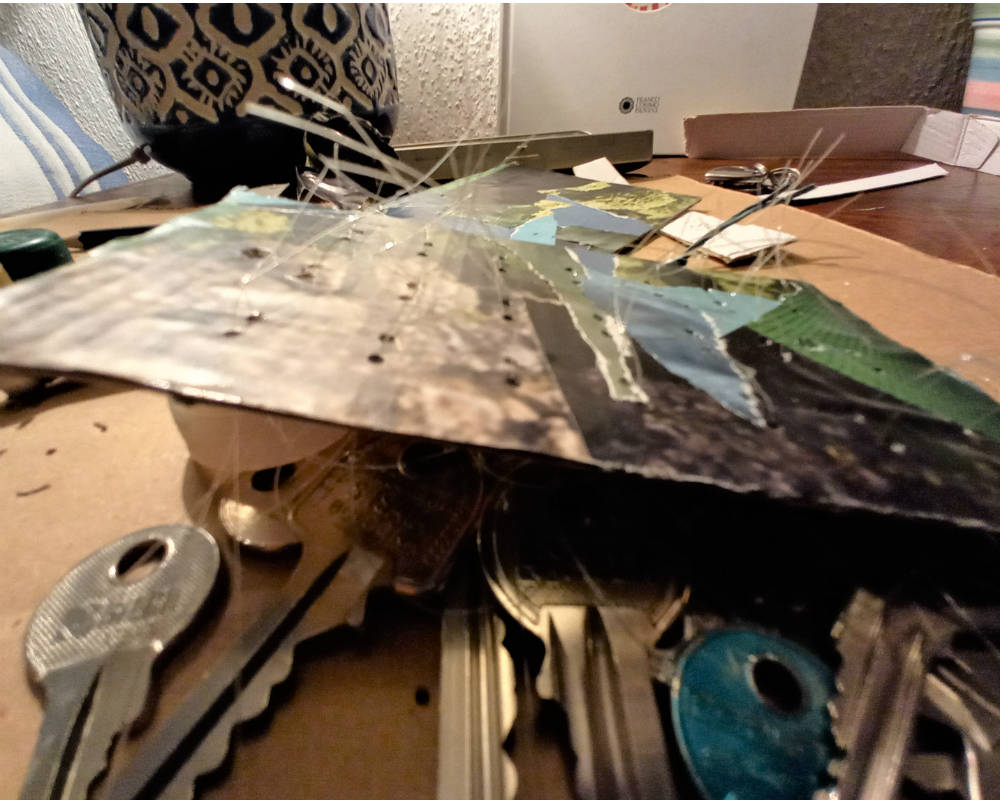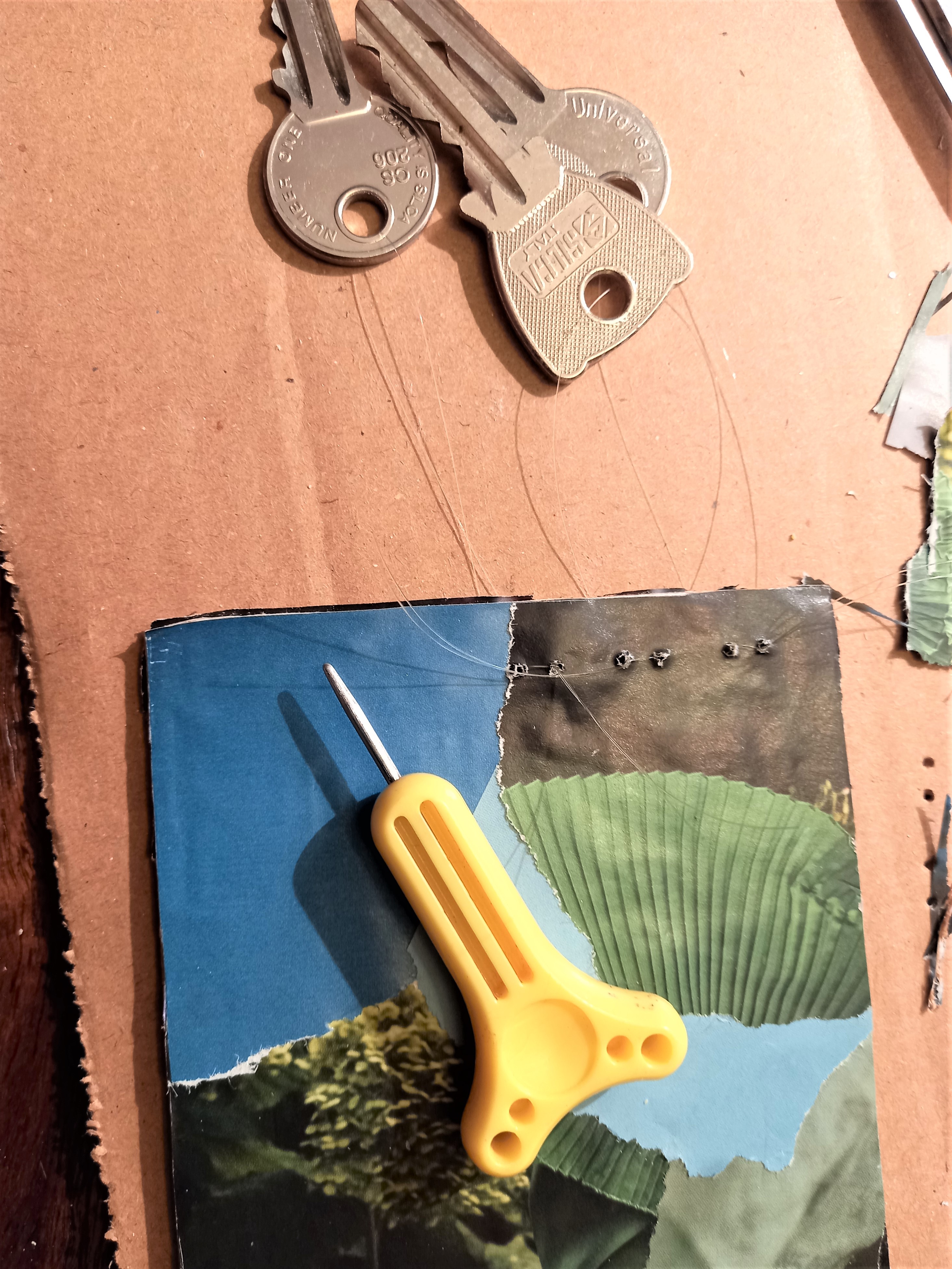 Poi, con cartoncino riciclato, ricavare un rettangolo e per le dimensioni ci si regola a seconda del numero di chiavi disponibili. Il cartoncino può essere decorato: io ho scelto la tecnica del collage a strappo