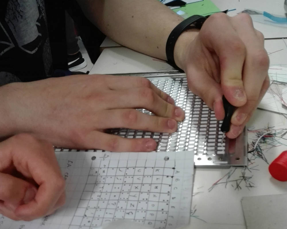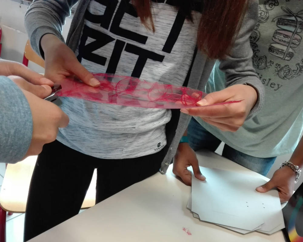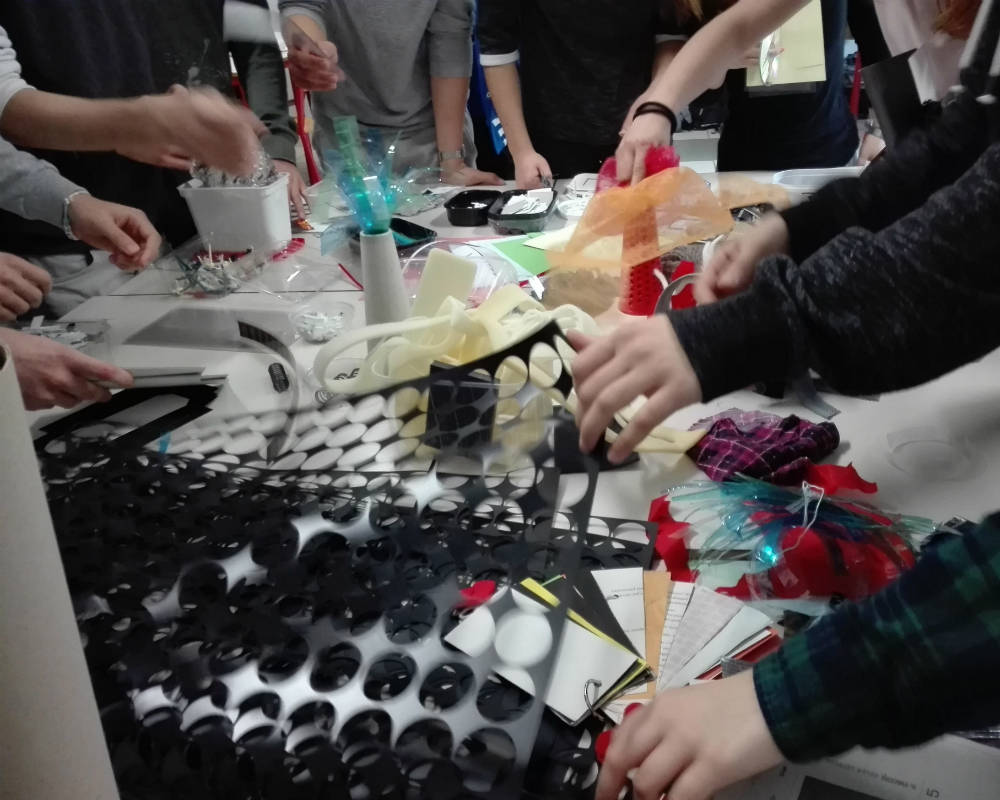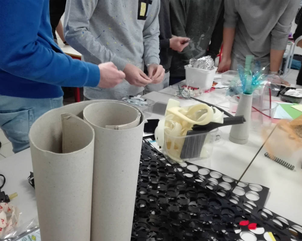 La classe è stata trasformata in atelier: un grande tavolo al centro sul quale sono stati esposti i materiali, circondato da quattro isole sulle quali hanno operato i quattro gruppi.