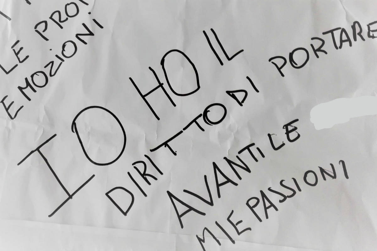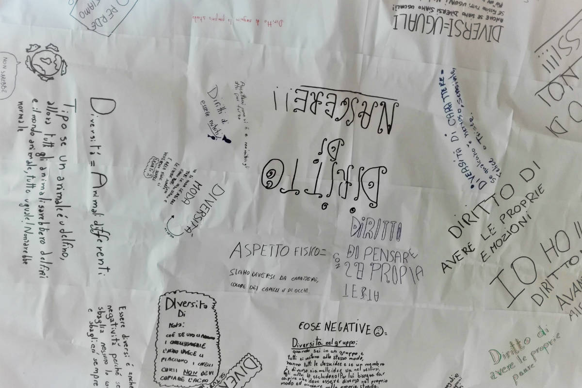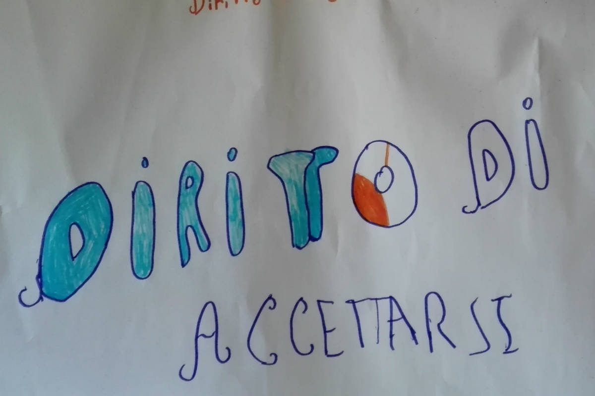 La riflessione è stata seguita da un brainstorming sui diritti che secondo i bambini dovrebbero essere aggiunti per garantire e proteggere l’unicità di ciascuna persona. Uno dei diritti che è stato scritto sul foglio-lenzuolo “Abbiamo il diritto di essere noi stessi”, è stato scelto come titolo del laboratorio.