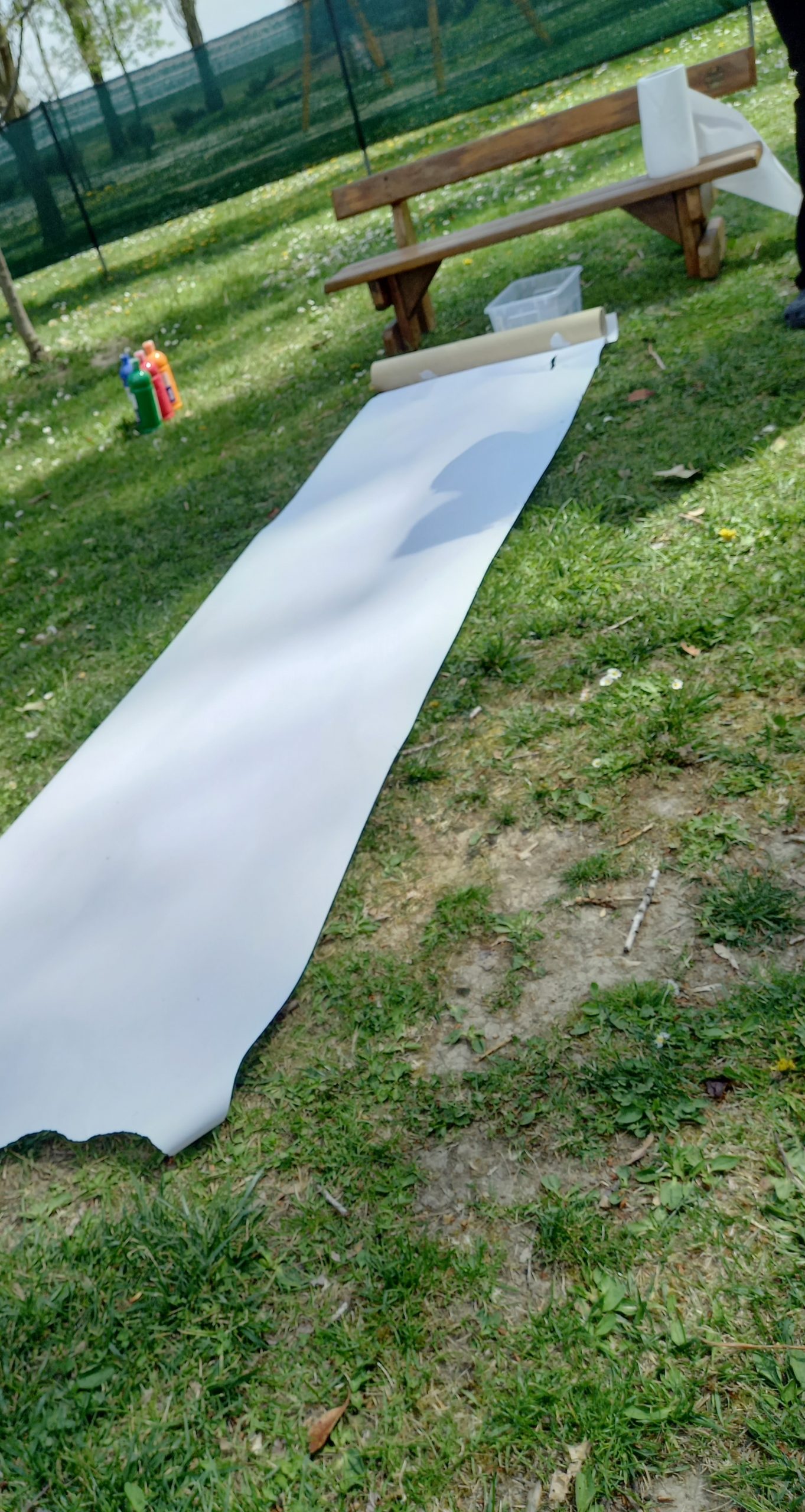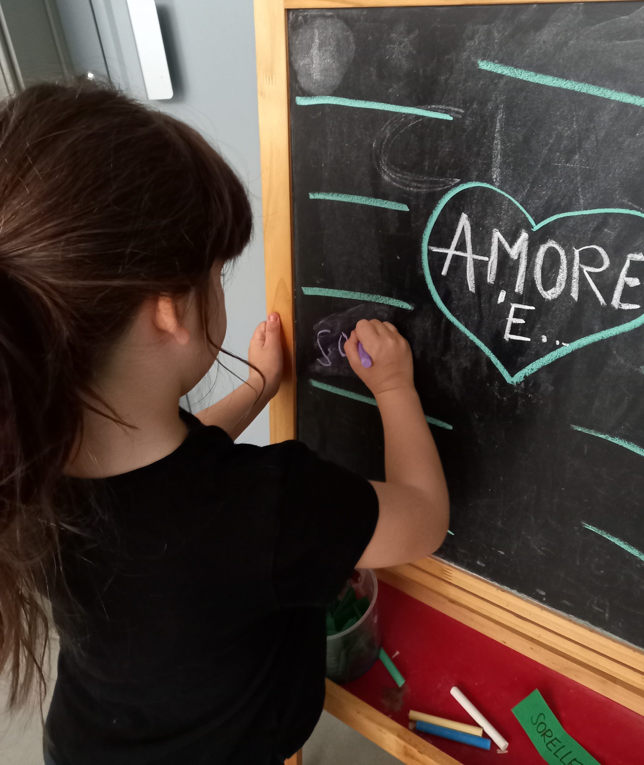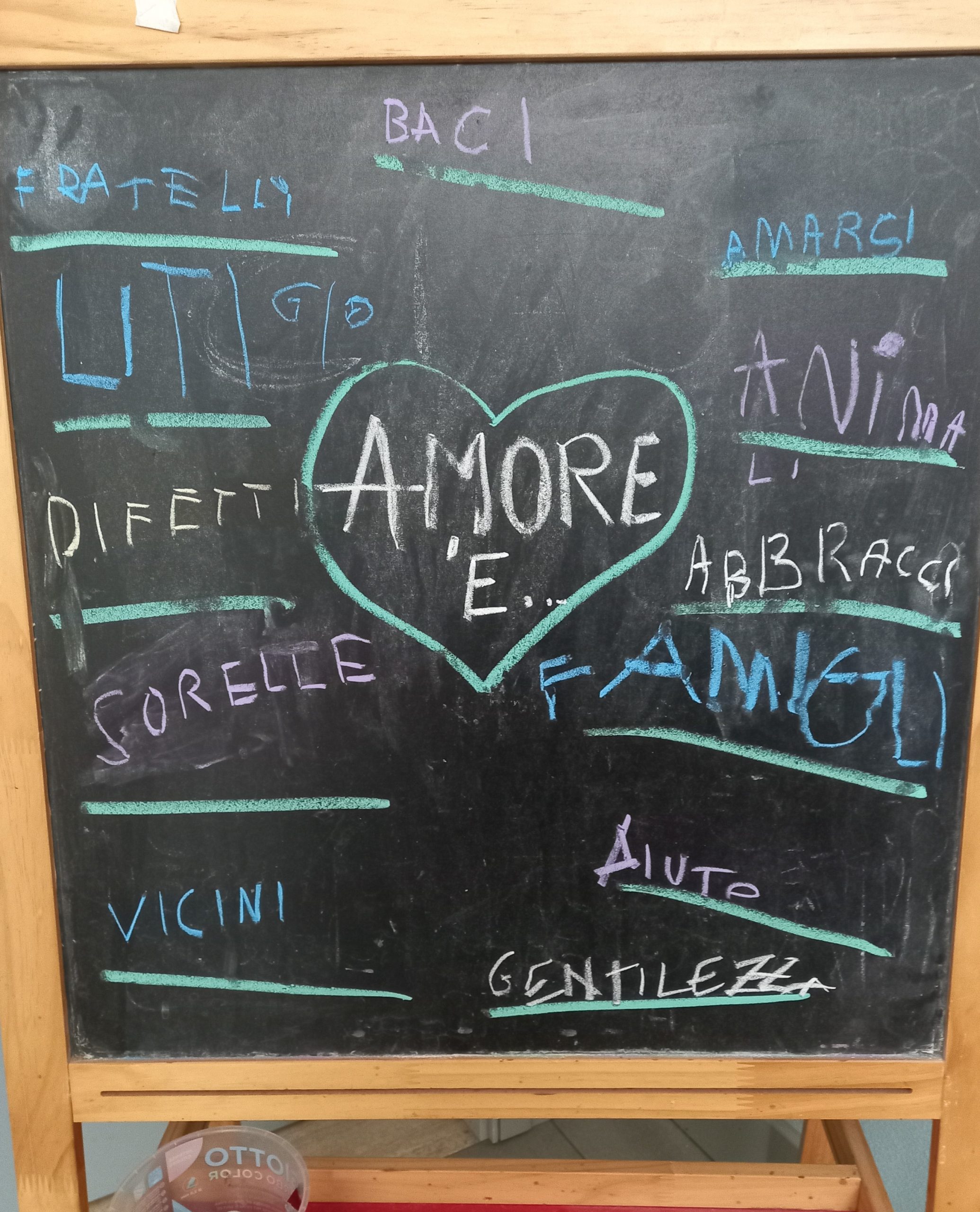 -attività: percorso motorio e scrittura. Il percorso della felicità aveva riscosso molto successo, così i bimbi hanno voluto realizzarne uno anche sull’amore. E visto che erano molto desiderosi di scrivere le parole emerse durante le riflessioni, è stata collocata alla fine del percorso una lavagna.