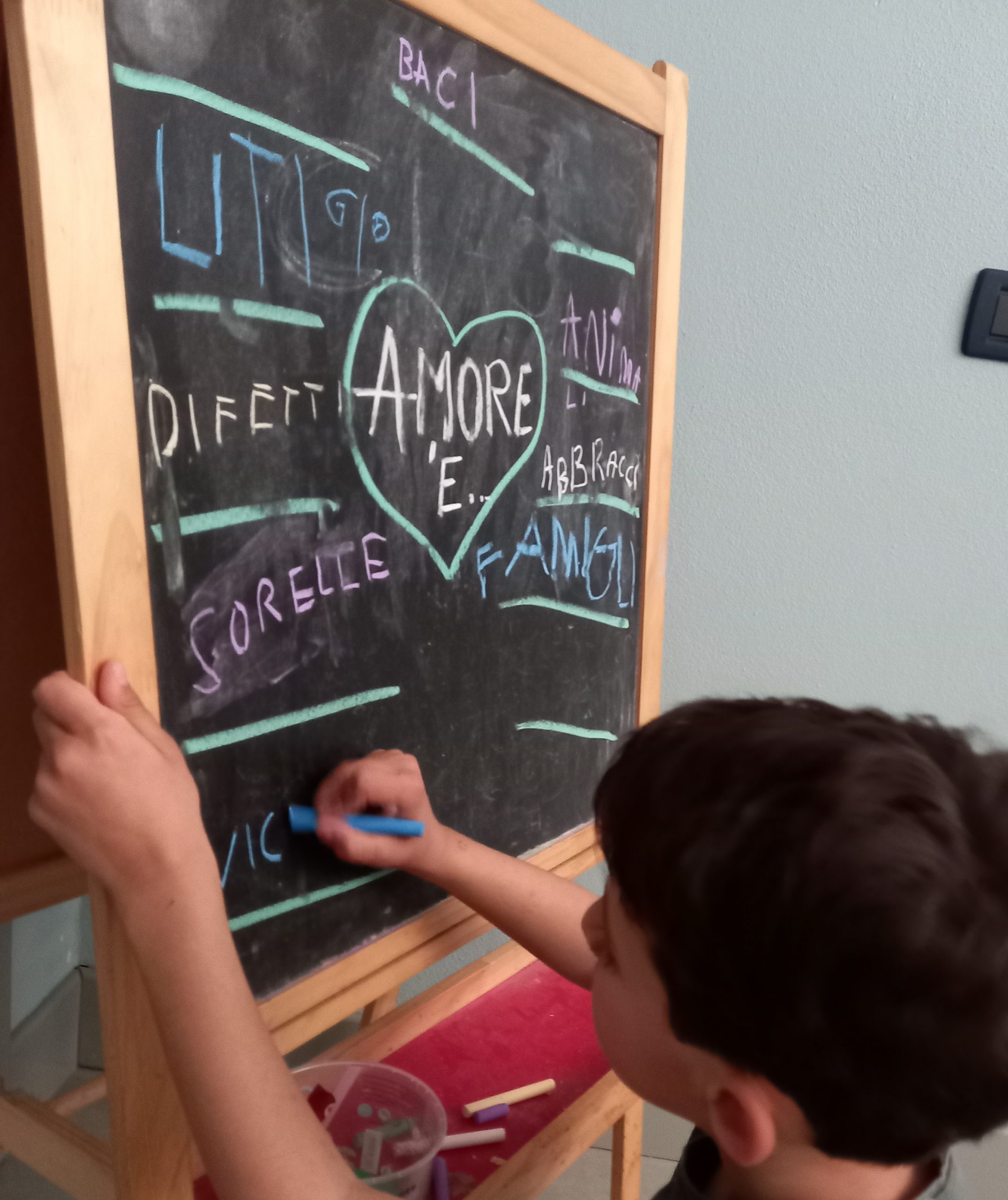 FAMIGLIA, AMARCI, ANIMA, GENTILEZZA, AIUTO, BACI, SORELLE, FRATELLI, DIFETTI, MAMMA E PAPA’, LITIGIO E PACE, STARE VICINI, ABBRACCI, VOLERE BENE AL MONDO, NONNI, MANGIARE INSIEME, SPOSARSI.