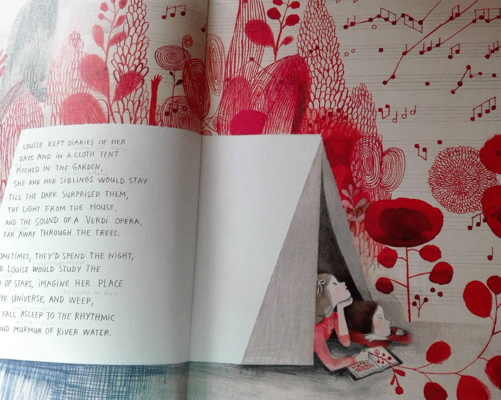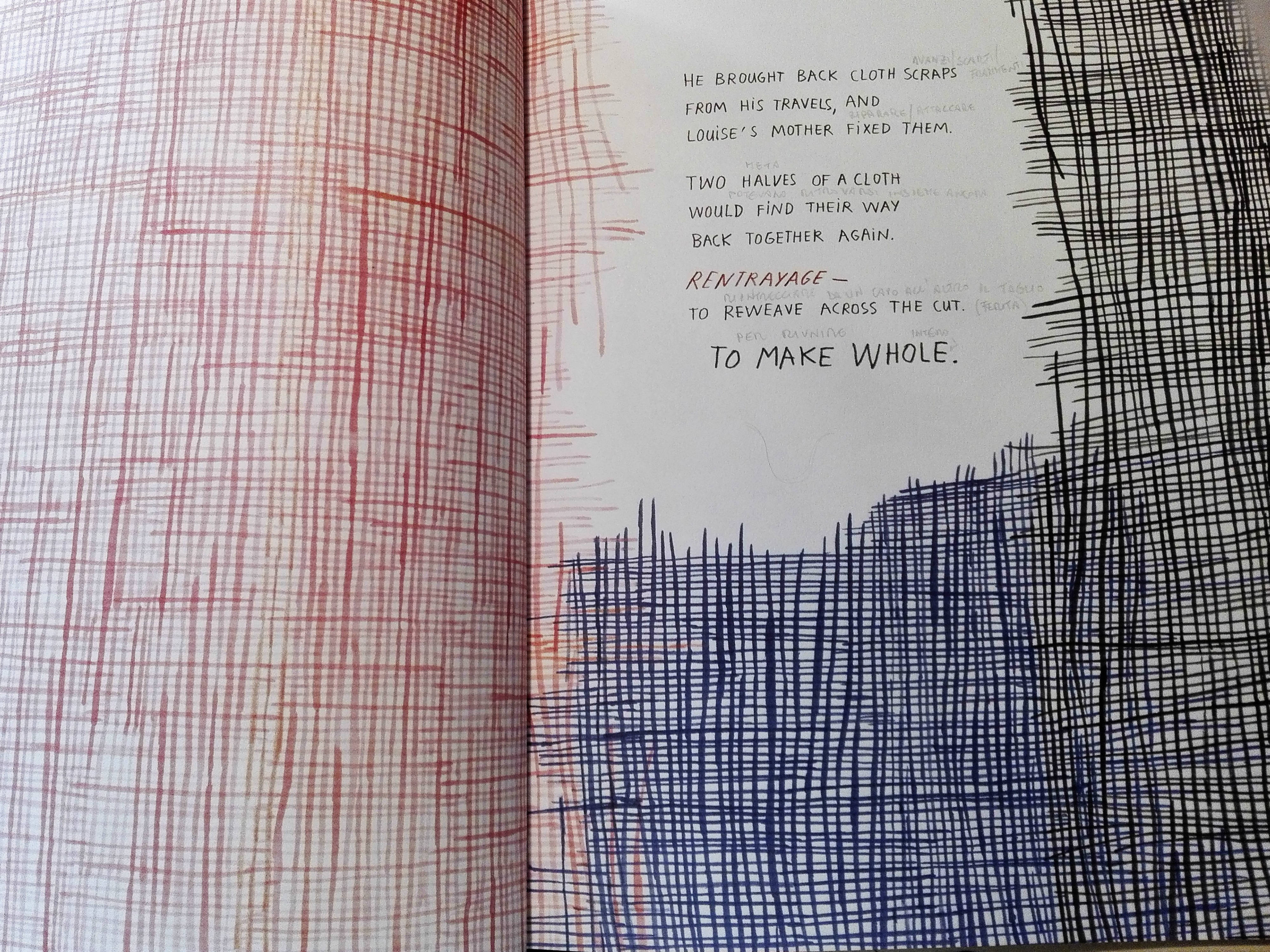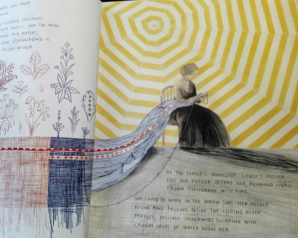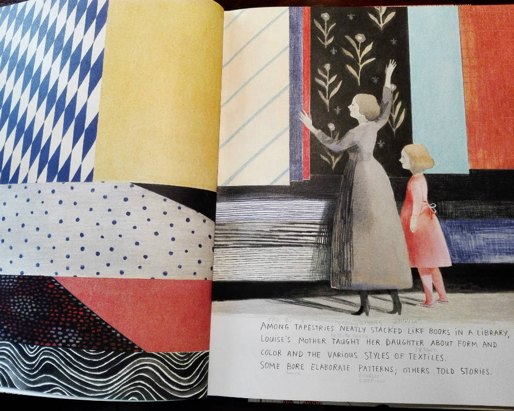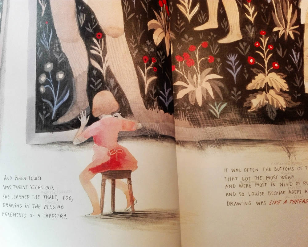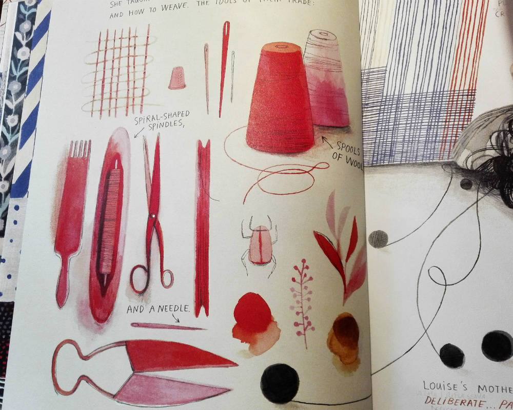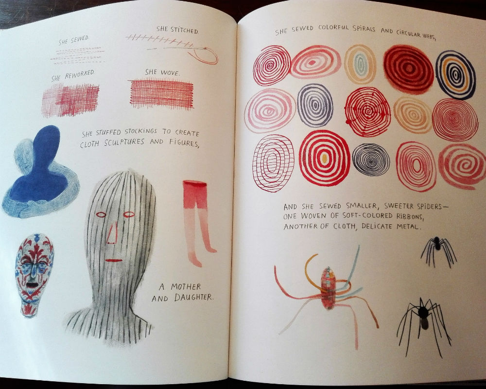 Bene, le illustrazioni che tanto mi tengono incollata sono tratte dal libro” Cloth Lullaby. The Woven Life of Louise Bourgeois” di Amy Novesky e Isabelle Arsenault (Ed. Abrams Books for Young Readers).
